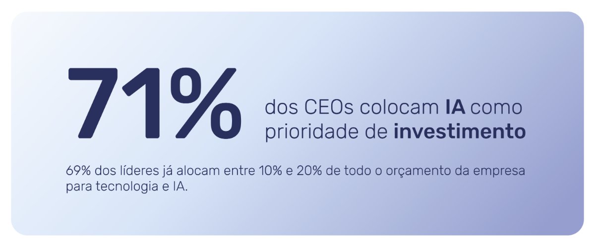Para entendermos a urgência dessa transformação, é essencial olhar para os indicadores de confiança dos líderes globais. De acordo com o estudo KPMG 2025 CEO Outlook, 71% dos líderes globais já estão apoiando fortemente a alocação de capital em IA para garantir a competitividade. Em 2025, 69% dos líderes alocavam até 20% do orçamento da empresa em tecnologia e IA. Esse dado, vindo de uma fonte com a qual a Accountfy mantém uma aliança estratégica, reforça que a adaptação tecnológica não é opcional.