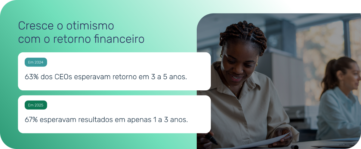 Além disso, o estudo aponta uma aceleração significativa na expectativa de retorno sobre o investimento em inteligência artificial. Se anteriormente o resultado era de longo prazo, a maioria dos CEOs agora prevê que ocorram em um período máximo de um a três anos. O que demonstra que a gestão financeira com IA já passou da fase de experimentação para a fase de resultados concretos.